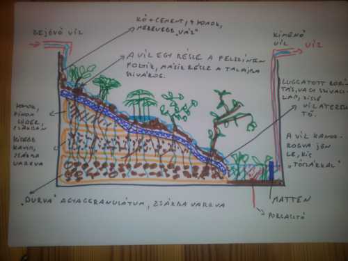 Mondjuk egy viszonylag mély, keskeny felület, azaz egy átlagaksi oldalt fordítva.. És ebben felülről lefelé egy lejtős talajon folyna a víz, azaz szembe velünk, hátulról előre, bele végül egy sekélyebb tóba, melyben "emers" növények vannak? Ha ez a lejtő egy gyökerekkel átszőtt szűrő, és a lefolyó víz részben a talajon át szivárogna a "tóba", részben kis patakként "kanyarogva" jutna le, növények gyöktörzsei között? Az aksinak lenne egy vertikális felépítése, azaz a tetejétől az aljáig látványaksi is lenne? Nyilván itt a tisztítást végző növények is gondozottak lennének, és ráadásul kicsik, kis fajták, ill. metszéssel lennének kordában tartva...