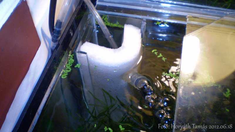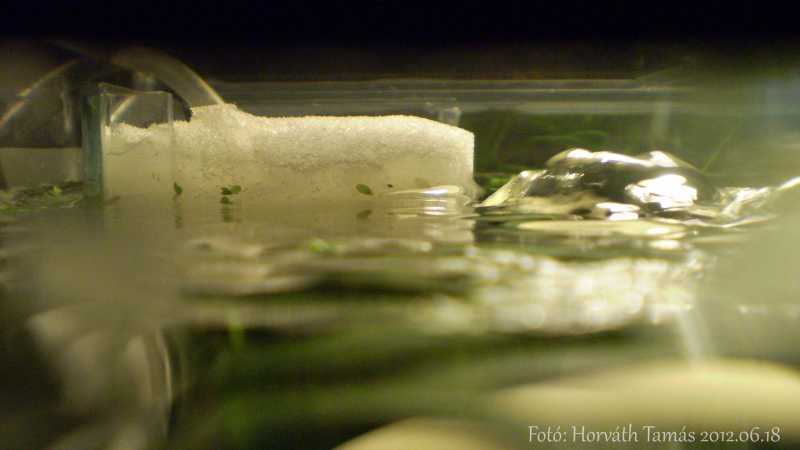 Még egy fontos észrevételem az ilyen szűrőkkel kapcsolatosan:mivel különálló egységként kerülnek be medencéinkbe,igen lényeges az elhelyezésük...nevezetesen az oldalfalaktól mért távolság!Sajnos nehéz eltalálni azt a rést,ahová halaink-csigáink nem szorulnak be..több nagyságrendű állomány esetén pedig szinte megoldhatatlan:(Ha most visszanéztek Szotyika első felülnézeti képére,látni fogjátok,hogy neki is ez volt egyik gondja..és még nem is említettük;)A békalencse megülése jelzi hogy ott az áramlat nem igazán ok,ráadásul mondom:a résbe bármi beszorulhat:(.