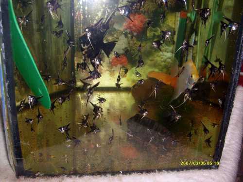 De az a kettő, amelyiket kiszedtem, egy "alomból" származnak és a nagyobb teljesen lecsipegette a másik úszóit. Ennél fogva kénytelen voltam visszatenni a nagyba, ahol azóta is a növények között bújkál.