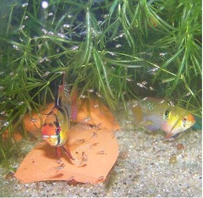 Ma reggel figyelem az Apisto-s akváriumomat, és azt veszem észre, hogy az egyik kókuszból, amit az egyik Hongsloi nöstény már több mint egy hete véd elkezdenek kishalak kiúszkálni! A nöstény ahogy figyeltem mindent elhajt a környékrõl, próbálja védeni a kicsinyeit!