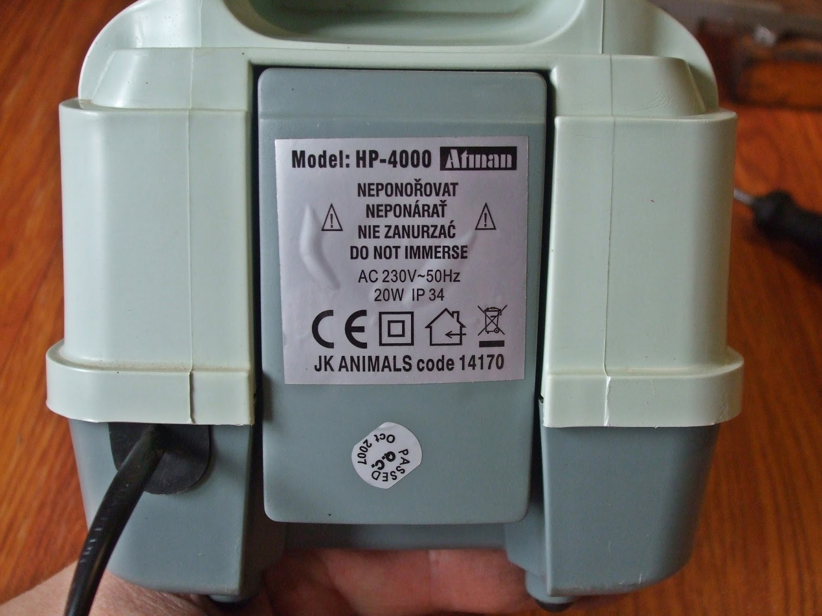 A FB idővonalamon így hát kezdetét vette egy "aukció", mert a korrektség jegyében szerettem volna a legjobb árat felkínáló leendő gazdinak megadni társam elérhetőségét. Legnagyobb meglepetésemre nem kis érdeklődés is támadt a pumpácska iránt szinte pillanatok alatt, jó volt hát a sejtésem hogy kell ilyen a kissé elhivatottabb -értsd több levegőt használó, több vízzel bíró- hobbitársaimnak! Amint megtudtam az Atman HP-sorozat e legkisebb tagja jelenleg nem is kapható, de szükség az felmerül iránta...alig 12 órával a kiírás után már meg is volt a leendő új tulaj, örömemre egy földrajzilag közel lakó akvarista társam kínált érte legtöbbet, ugyanakkor korrekt módon reális árat is. Átadtam neki a pumpa eladójának mailcímét, ők lelevelezték- a pumpa meg nálam landolt! :) Én kis kíváncsi megkértem az új gazdit hogy az állapotfelmérés és a belső takarítás fejében hadd szedjem szét, és így is lett- ezen írásban hát ezt a használt HP 4000-et láthatjátok a maga valójában.n HP- mára akinek ezt mondják nagy valószínűséggel ipari levegőpumpára gondol. Nem is véletlenül, hiszen elterjedtek, akik régebben használják megbízhatónak is tartják. Áruk is mondhatni baráti- használtan is megbecsült társunk lehet a hobbiban. Kezdjük is azonnal az ismerkedést, íme a doboz és az azon látható paraméterek: