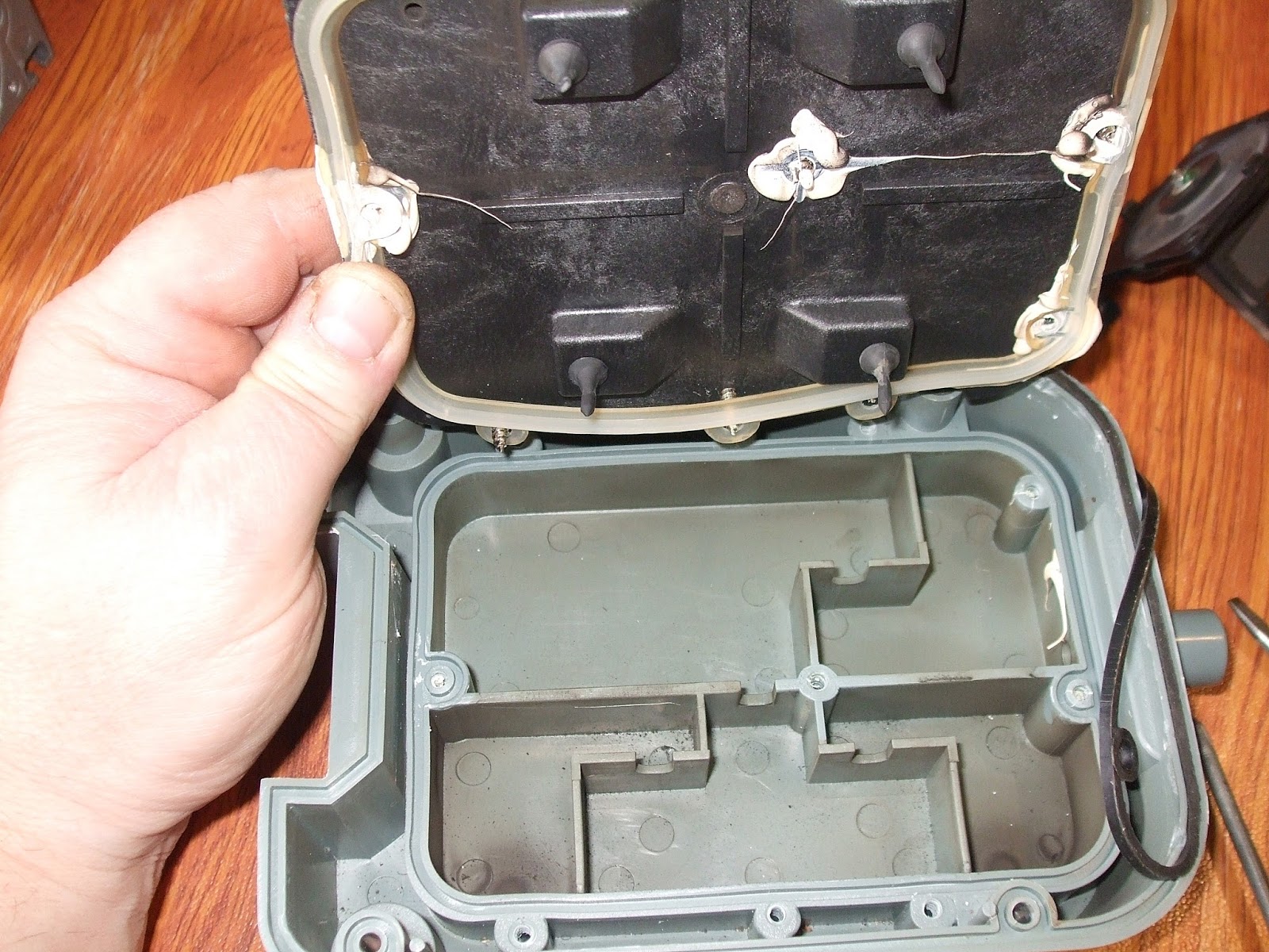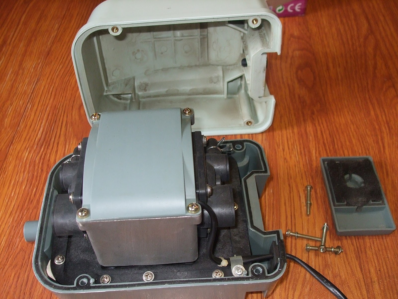 Miután a rögzítő csavarokat eltávolítottuk felemelhetjük az ennél a pumpánál műanyagból fröccsöntött alaplapot, és betekinthetünk a levegőgyűjtő és terelő alsó burkolatba. Amint látod itt nincsenek szivacsbetétek, ha reménykedsz a nyomóoldal zajcsillapításában esetlegesen be is szabhatsz Tm 20 cellaméretű szivacsdarabkákat.