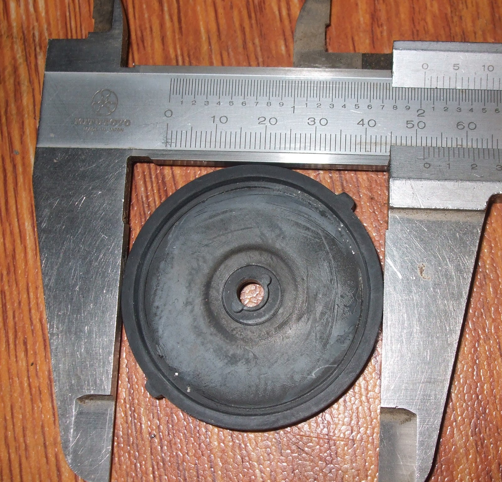 Következzen a mérés, lássuk mennyi az annyi- a képen leolvashatjuk hogy a dolgozó gumilap cirka 52mm átmérővel rendelkezik. ez azért is hasznos, mert alkatrész vásárláskor felkészült leszel, és nem fordulhat elő hogy esetleg nem ehhez való lapot vásárolsz. Akik hosszú távra terveznek és nem szeretnének meglepődni azok máris beszerezhetik ezt az alkatrészt-pontosabban ebből kettő darabot hiszen a pumpa alternáló mozgása mindkét oldalon ilyeneket mozgat: