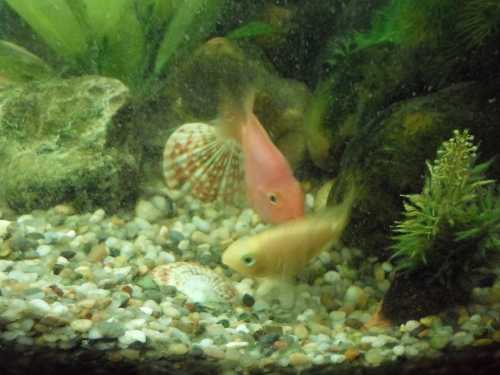 A sok sikertelen próbálkozás után feladtam, és a 2 "tenyészpárt" és a 3 megmaradt kicsit beraktam egy csapvizes társas akvériumba, ahol sok növény van, tápozás, sok hal, havi egy vízcsere.(az eredeti lágyvizes akváriumukban heti egyszer volt vízcsere)