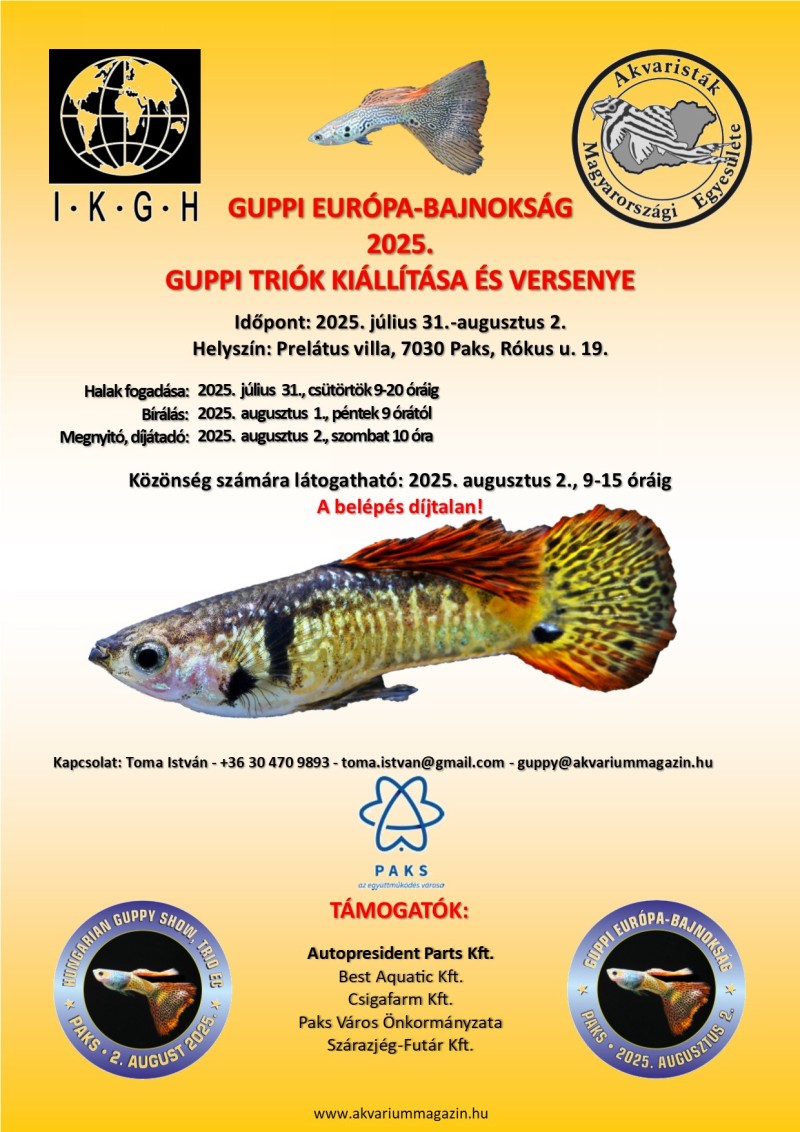 Augusztus másodikán érdemes Paksra látogatni a guppik szerelmeseinek! Az Akvaristák Magyarországi Egyesülete minden érdeklődőt szeretettel vár! A belépés ingyenes! Részletek lejjebb!