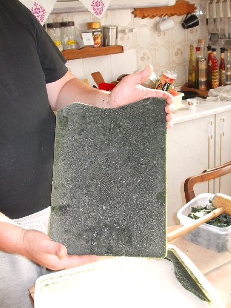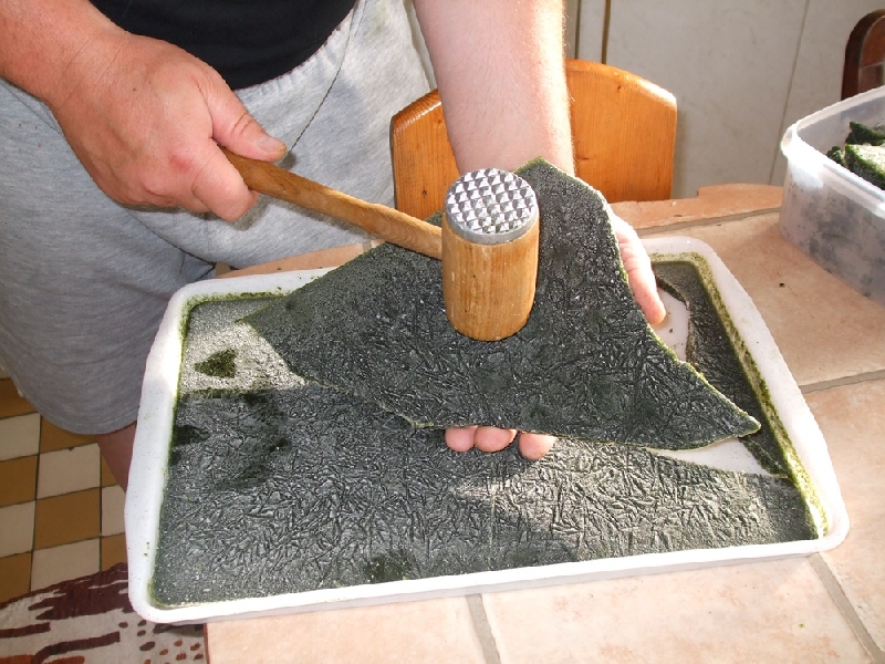 Kisgyermekorom óta fogyasztom néha sóskalevesként,sőt mártásként is....hmm! Tehát így alakul az őszi ancibrikettem összetétele: -50% csalán/Urtica dioica/ -40% gyermekláncfű/Taraxacum officinale/ -10% vadsóska/Rumex acetosa/ -kötőanyagként zselatin/20g 4 literbe/ Nem muszáj a márkás..már mindegyiket használtam. Ezt pontosan úgy készítem mint az eredeti briketttet,ám figyelek a főzési időre...sőt valószínűleg kizárólag párolással fogom eztán készíteni.Nincs szükség a szétfőzésre,tényleg csak pár percről van szó-a rostok éppen csak hogy fellazuljanak.A mixeléssel segítek azon halaimnak akiknek nincs semmiféle "reszelőjük"-a guppik,corydorasok is fogyasztanak belőle!Sőt-a C. paleatusoknak,és a C.aeneus változatoknak heti egy alkalommal főétkezésként is adom....megvesznek érte!:) Ha megvagyok a mixeléssel belekeverem a meleg mixbe a zselatint,és beállítom egy kis félretett főzővízzel a konzisztenciát.Nagy tálcákra terítem,megrázogatom hogy szépen szétterüljön,aztán következik a ballaszt anyag beszórása.Én maximum 5mm-es kavicsot használok hogy azonnal süllyedjen-ezt 05-ös sóderből rostálom,mosom,savazom-,de enélkül is használható.Ha nehezítő anyag nélkül készítjük a brikett nem merül el azonnal-figyeljünk hogy alámerüléskor viszont ne valamely növényünk levelein landoljon. A "kaviscszórásról" egy kép: