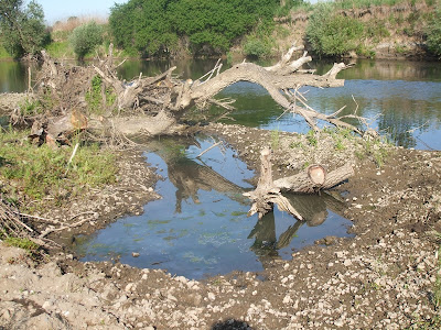 A fát természetesen személyesen ismerem....tudom honnan hozta a 2010-es áradat,tudom hogy mekkora döbbenet volt amint a víz kiharapván alóla a partoldalt végül ide görgette.A nyáron ebben a kis mederben számtalan kis halacska maradt fogságban..a kavicságyon a víz kiszaladt alóluk,elzárta őket a szabad víztől a fa íve alatt látható sóder felrakódás.Én kapámmal szabad utat engedtem nekik....íme a megmentett,és ekkor már a szabad vizet megérző kis halacskák-ez nem akvarisztika,de tudom érteni fogjátok milyen jó érzés volt látni elsuhanó kis testüket a folyóban.E kép nekik állít emléket: