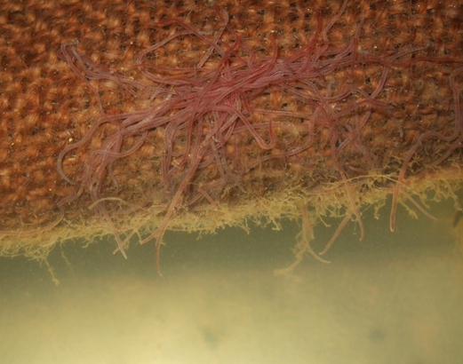 A zsákszövet legkisebb redőjében is otthonra találnak,a lágy vizet-esővíz-pontozzák.Próbálkoztam az élesztős víz etetésével,a spirulina tablettával,és egy magas fehérje tartalmú száraz táppal is.Azon kívül hogy rettentően jó kondiban vannak,mostanában érdemi szaporodást nem tapasztalok.Nem vagdalom őket...inkább a spontán fragmentálódásban bízva időzavaromban most inkább a megőrzésükre apellálok.Bízom benne hogy a későbbiekben lesz elegendő időm-addig pedig ők akklimatizálódnak a nálam lévő körülményekhez/itt nem a hőmérsékletre gondolok!/.